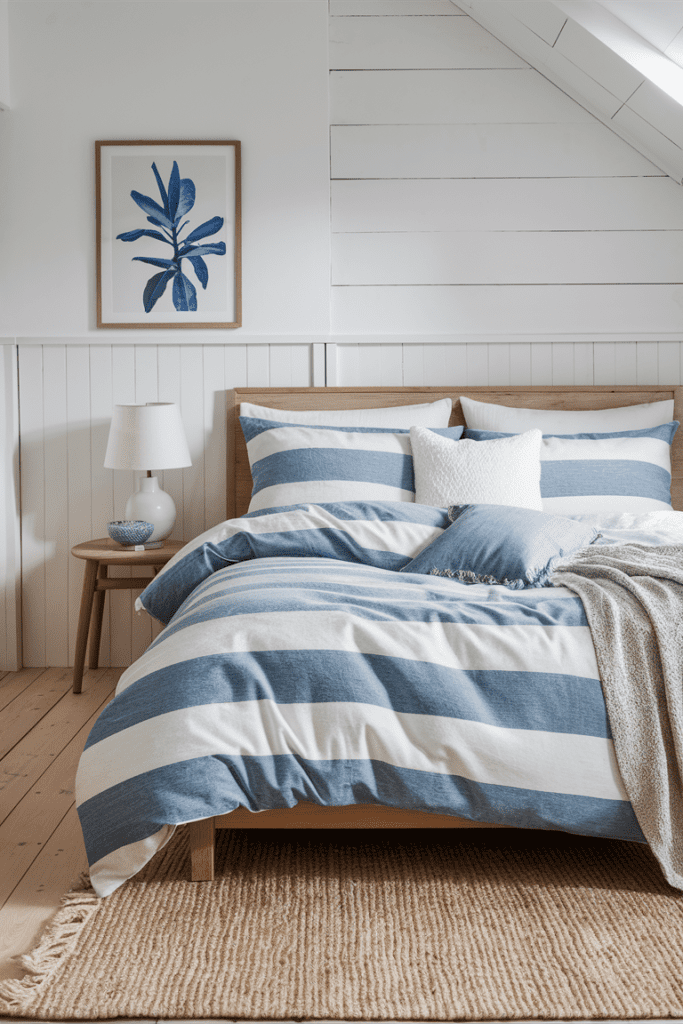 - Striped Duvet Covers: Nautical stripes in blue and white add a traditional coastal touch.