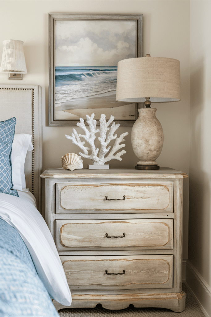 Bringing natural elements into your bedroom can enhance the coastal theme. Think of items that you might find at the beach or in the ocean.